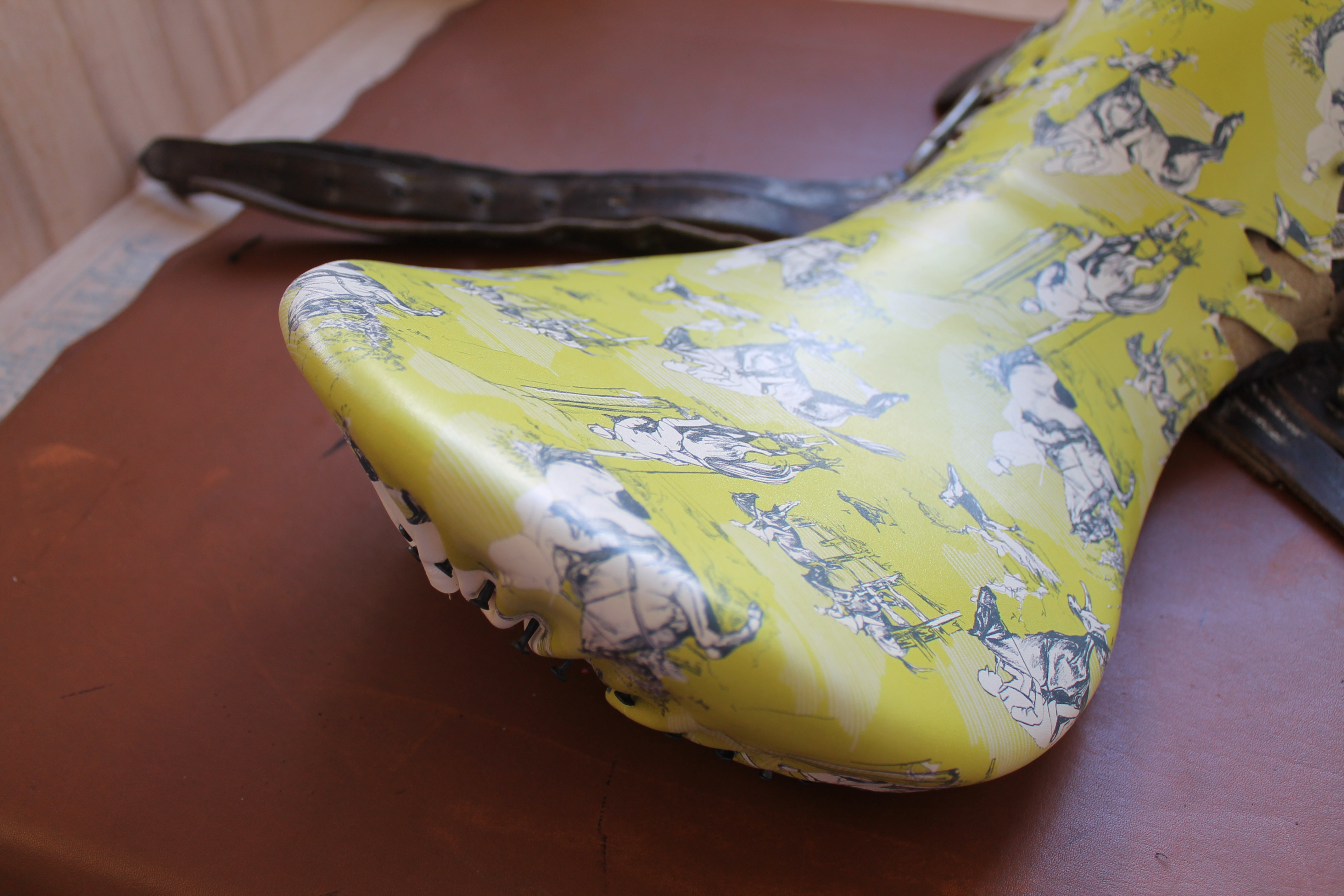 Initially Ellie wanted to use her own designs on a full seat of an old Bliss saddle. However it was decided that it would be best if Bliss did the printing as well as the re-seating. Ellie advised us “I have spoken to my print technician and I think for a more professional finish I feel I would like you to help me with the leather printing instead of printing them myself as I think the pigment I would use would crack when stretched to fit the” saddle” .