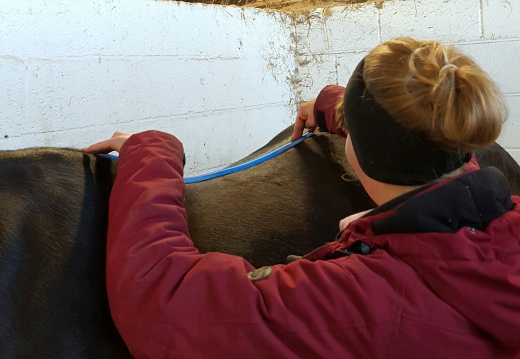 We then used the flexi-curve to make a template of his shape over where the tree points will sit (and not his whither as I thought!) this will be used to make an exact measurement for the width of the tree. We also took a flexi-curve measurement of T18 (the last rib) and his horizontal profile from the whither down the spine. These will be recorded for future comparisons. Photos are taken of these measurements which fitters will send in with orders to discuss with Nikki the options regarding panel and trees profiles.