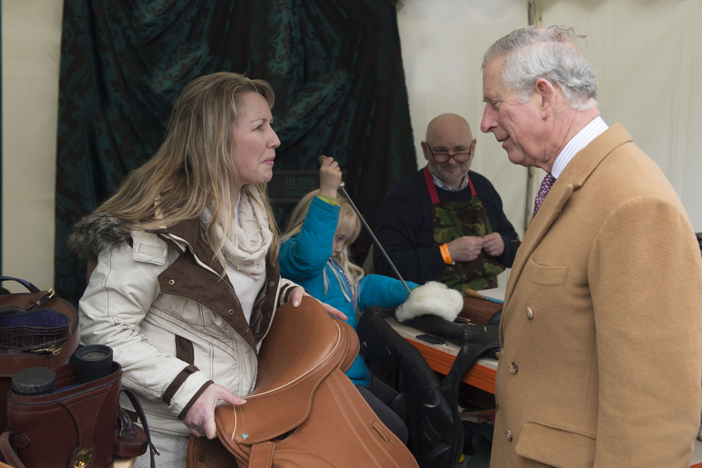 HRH The Prince of Wales and The Dutchess of Cornwall attended the event, particularly enjoying the sheep racing where they were seen to be having quite a giggle. We were asked if we would receive a visit to our stand, where we were able to show case leather making skills to HRH The Prince who asked about the leathers and work involved in the top hat case. Even Erin managed to get in on the action by trying to flock a panel, where the Prince was happy to offer some advice on the process. Being an accomplished horseman himself the saddles were of great interest and he was keen to learn more about our production and export success.